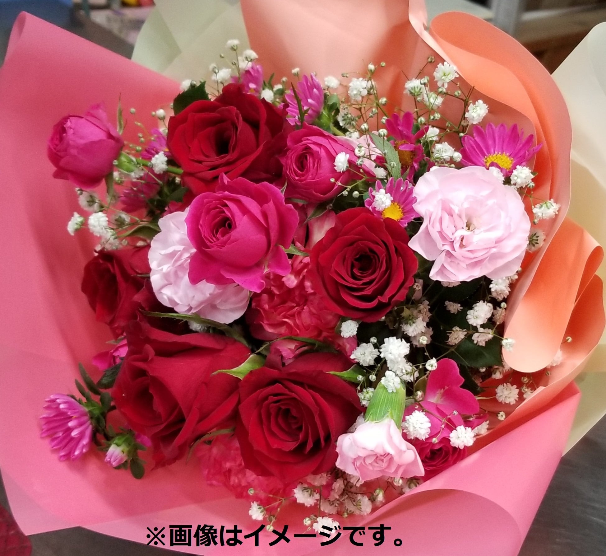 母の日ギフト用の花束です。季節のお花で「おまかせ」でお作りしますので、ご了承ください。お色合いは「赤xピンク系」「黄xオレンジ系」「ブルーx紫等(シック)系」「おまかせ」から選べます。特に指定がない場合は、明るい感じでお作りします。なお、お花のご指定は出来ません。ご了承ください。写真はイメージです。実際のものとは異なります。