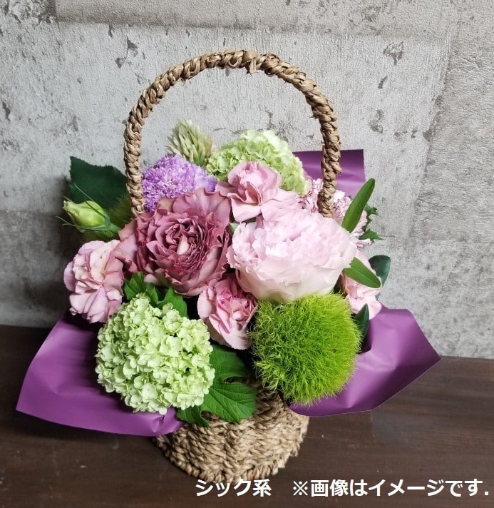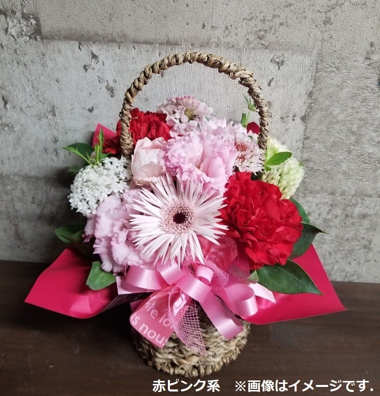 母の日ギフト用のアレンジメントです。季節のお花で「おまかせ」でお作りしますので、ご了承ください。お色合いは「赤xピンク系」「黄xオレンジ系」「ブルーx紫等(シック)系」「おまかせ」から選べます。特に指定がない場合は、明るい感じでお作りします。なお、お花のご指定は出来ません。ご了承ください。写真はイメージです。実際のものとは異なります。